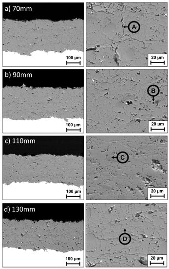 SEM micrographs of the sample’s cross-section (magnification 200× and 1000×). The spray distance is depicted in the following order—(a) 70 mm; (b) 90 mm; (c) 110 mm; (d) 130 mm. A—macro-crack; B—pore; C—unmolten particle; D—splat boundary.