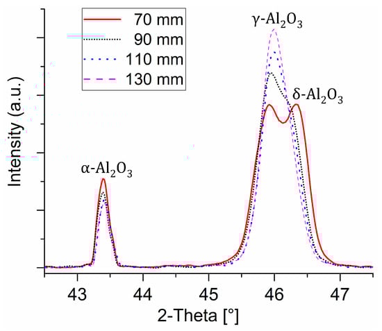 Detailed excerpt from the XRD analysis of AlO samples showing a rising peak at 2 (46.3°) toward lower spray distances.
