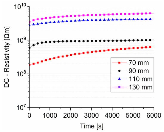 To measure the DC resistivity and the dielectric response function, a round electrode with a diameter of 40 mm was painted on the samples using conductive silver varnish. To minimize the effect of surface currents, a guard electrode was painted around it. The samples were conditioned as described above. The DC resistivity was measured using an electrometer (Keithley Instruments 6517B, Cleveland, OH, USA). The measurement was conducted in a grounded metal box under ambient conditions. The measurement voltage and duration were chosen in accordance with IEC 62631-3-1:2016 [] to be 100 V and 100 min, respectively. The dielectric response of the samples was measured by means of a broadband dielectric analyzer (Novocontrol Alpha A. Analyzer, Montabaur, Germany) with a four-wire interface (Novocontrol ZG4, Montabaur, Germany). The measurement was carried out in the frequency band of 10 mHz to 100 kHz at a root mean square voltage of 1.5 V. As the samples used for these measurements were bigger in size and the measurements itself took a long time, only one sample per spraying distance was tested. As the volume of these samples was substantially bigger than that of the cubic samples designated for breakdown testing, and the investigated properties are integral in nature, it stands to reason that the results will be sufficiently precise.