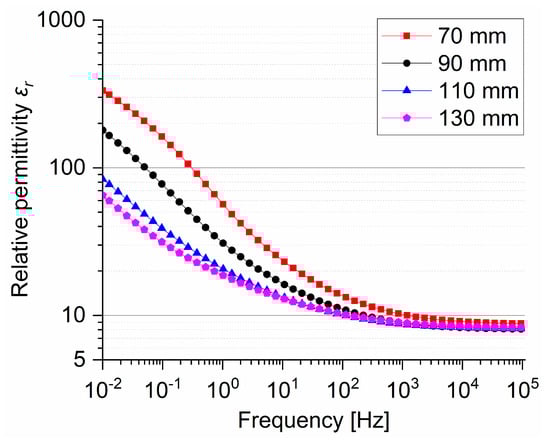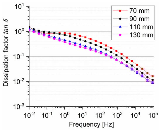 At high frequencies, ohmic conduction vanishes in comparison to the capacitive one. Two possible explanations are that the moving charge carriers no longer accumulate at the internal interfaces, or that the dissipation current in the moist vertical cracks ceases. Therefore, the polarization is dominated by atomic and lattice polarization. Consequently, the respective relative permittivities of the samples all range around 8, with the 70 mm sample showing a slightly higher value, which can be accredited to the phase composition. Figure 7 shows the respective dielectric response of the samples. The curves show a trend that is similar to that of the permittivities, with the shorter spraying distances displaying a slightly higher loss. The values range from between 1.50 (70 mm) and 1.12 (130 mm) at 10 mHz to between 0.0162 (70 mm) and 0.00949 (110 mm) at 100 kHz. At high frequencies, the samples sprayed at a shorter distance show a slightly higher loss tangent. The differences markedly increase in the frequencies at which the interface polarization starts to affect the first sample. It is known that polarization mechanisms cause increasing losses during the frequencies at which the respective polarization mechanisms start to decay []. As the onset frequency of the interface polarization is different for each sample and so is the resulting peak in losses. The shift of these peaks may cause the curves to diverge at medium frequencies and to converge at the low end of the measured spectrum. Further investigation at lower frequencies is required to test this hypothesis.