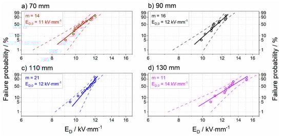 For solid insulating materials, dielectric breakdown data are expected to conform to Gumbel or Weibull distributions []. The results were therefore fitted to the two-parameter Weibull probability density function (Equation (2)).