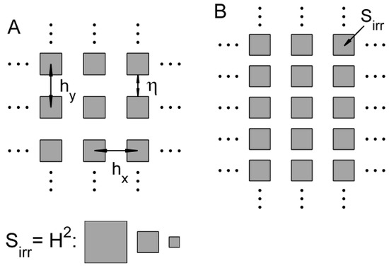 Two pattern schemes (Schemes (A) and (B)) used to form domain structures. Patterns contain periodically arranged squares. Below, for clarity, the relationship between the areas of squares (Sirr) whose side H takes values 1 μm, 0.5 μm, and 0.25 μm is presented. See also the text.