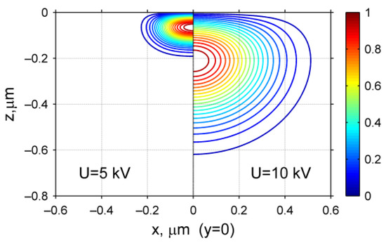 Calculated distributions of injected charges for Scheme A at H = 0.25 μm and accelerating voltages of 5 kV and 10 kV. The distributions are normalized to their maximum values. The isolines are drawn in increments of 0.05.