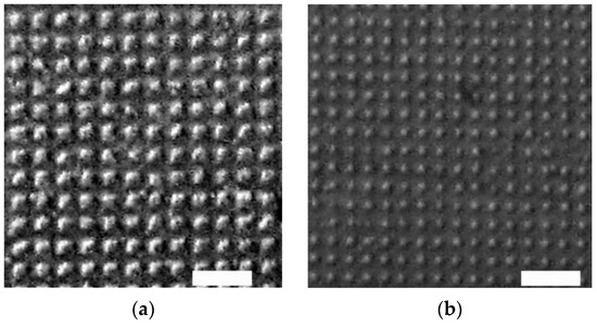 The figure indicates that for squares with sides of 1 µm and 0.5 µm, the distribution of domains is fairly regular throughout the writing region (Figure 3a,b). As U increases from 5 kV to 10 kV, the average size of the domains grows (Figure 3d). For the small squares (H = 0.25 µm), no RDS was detected at either 5 kV (Figure 3c) or 10 kV. The size of the detected (“surviving”) domains in this case do not depend on U and are close to the size of the regular domains written at H = 0.5 µm and U = 5 kV (Figure 3d).