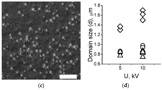 The results in Table 1 show that the regular domains at EBDW-Me are successfully formed according to the arrangement of squares in the patterns under the action of very high field levels of 109–1010 V/m (this is about two orders of magnitude higher than the value of Ec). These values are comparable to the domain nucleation field under the high-voltage AFM tip [34] and in the standard e-beam writing method without a top metal coating [18,31]. Decreasing U from 10 kV to 5 kV expectedly reduced the diameter of the writable domains, which were almost oval-shaped in the optical images. The minimum size achieved corresponded to the domain diameter of 0.7–0.8 µm (Figure 3d). However, when the size of irradiated squares is further reduced H from 0.5 µm to 0.25 µm, the RDS writing is violated not only for 10 kV but also for 5 kV (Figure 3c). See also Ref. [21].