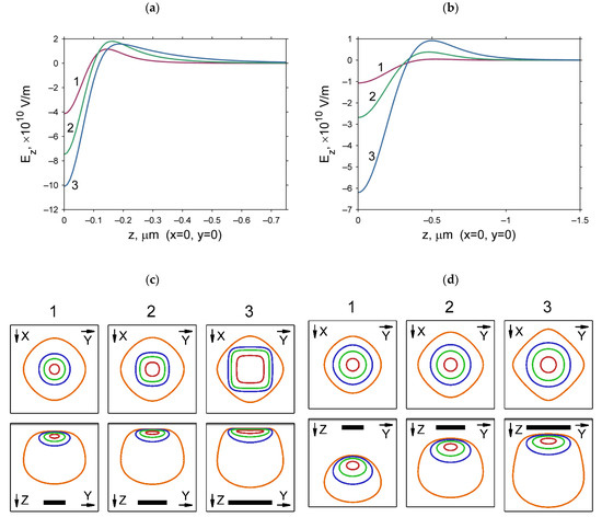 Distributions of electric field strength Ez calculated for Scheme A and a dose of 5000 µC/cm2. Left—U = 5 kV, right—U = 10 kV. The numbers 1, 2, and 3 represent variants with H = 0.25 µm, H = 0.5 µm and H = 1 µm, respectively. (a,b) The distributions of Ez by depth in the center of the squares. (c,d) Contours of zones where Ez has values not less than 0.9, 0.6, 0.3, and Ec. These contours are colored red, green, blue, and orange, respectively. The upper row is the contours obtained by crossing the zones with the XY plane in the positions where these zones have the maximum cross-section. The images are presented in regions of hx × hy size. The bottom row is the contours of the zones in the YZ plane passing through the center of the squares. Black bar marks correspond to the length H.