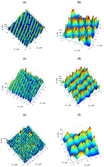 AFM images for patterns with squares arranged according to Scheme B. Above—H = 1 µm and hy = 1.2 µm (U = 5 kV and D = 5000 µC/cm2), in the middle—H = 0.25 µm and hy = 0.4 µm (U = 5 kV and D = 5000 µC/cm2), below—H = 0.25 µm and hy = 0.8 µm (U = 10 kV and D = 20,000 µC/cm2). (a,c,e) — Large area scan results. (b,d,f) — Scan results on smaller areas.