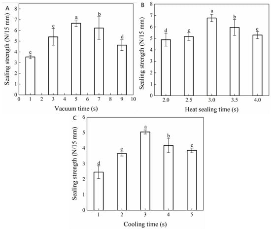 The operational panel of the vacuum packaging machine indicated that the vacuum pressure was regulated by the vacuum time and increased gradually with the extension of the vacuum time. Accordingly, Figure 2A reflects the influence of vacuum time on the heat-sealing strength of the composite films. At shorter vacuum times (<5.0 s), the vacuum pressure was maintained between 0.02 and 0.06 MPa, resulting in poor sealing strength. This may be ascribed to insufficient adhesion between the two films and the existence of gaps as a consequence of the low vacuum pressure. The thermal sealing strength of the composite films increased substantially with a prolonged vacuum time, peaking (6.67 ± 0.30 N/15 mm) at a vacuum time of 5.0 s. However, by further prolonging the vacuum time (>5.0 s), the vacuum pressure gradually increased to 0.08 MPa, which resulted in a gradual decrease in the heat-sealing strength of the composite films. During the heat-sealing process, the seal area became tapered with the application of heat. After increasing the vacuum pressure, the area surrounding the seal appeared crimped and deformed, resulting in a reduced sealing strength. Thus, when a pressure was applied that exceeded a certain limit, a fracture occurred [33].