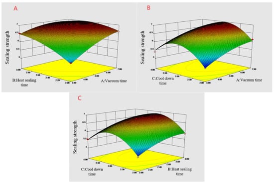 Response surface diagram of the influence of the interaction of various factors on the strength of the heat-sealing. (A) Vacuum time and heat-sealing time interaction; (B) vacuum time and cooling time interaction; and (C) heat-sealing time and cooling time interaction.