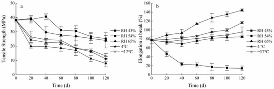 The mechanical properties of packaging materials should be kept relatively stable to facilitate food protection during the storage process and to extend the shelf life of the food. The changes in TS and EAB of the FG-Ara composite films stored in different environmental factors are shown in Figure 5. Overall, the TS of the FG-Ara composite films demonstrated a decreasing trend, while the EAB demonstrated an increasing trend. In the low humidity environment (RH 43%), the TS initially increased before it decreased with time, and peaked (40.61 ± 1.88 MPa) at 20–40 days, which was 6.25% higher than the initial value. Furthermore, the EAB decreased significantly from 0 to 40 days, after which it gradually stabilized. After 120 days of storage at low temperatures (4 °C, −17 °C), the TS of the composite films decreased to 11.15 ± 1.64 and 13.14 ± 1.68 MPa, respectively, while the EAB increased substantially by 39.07% and 18.29%, respectively, compared to the initial values. At an ambient humidity of 65%, the TS decreased and the EAB increased with time, and the largest change was demonstrated at 60 days, at which time the TS decreased by 79.25% and the EAB increased 0.86-fold compared to the initial value.