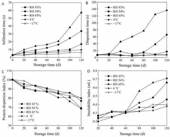 The packaged milk powder was stored at freezing (−17 °C), cold (4 °C) and room temperature (25 °C, RH 43%, 54%, and 65%), and the contents of the packaged milk powder were determined in 20-day increments.