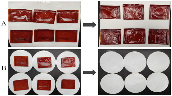 (A) is the composite film oil coating before (left) and after (right) throwing. (B) is the compressed composite film oil packaging sample (left) and filter paper (right).