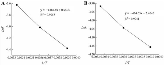 The k value was obtained at different temperatures, and a linear equation was obtained by plotting Lnk against the reciprocal of the thermodynamic temperature (1/T). Table 7 and Figure 8 demonstrate the determination of EA and k0 [32,46].