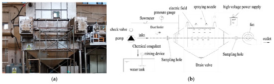 Wet electrostatic precipitator system. (a) is the field physical diagram of WESP. (b) is the internal structure of WESP.