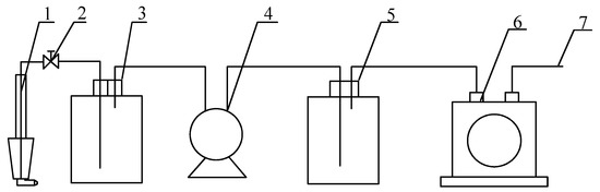 In this experiment, the isokinetic sampling method was used for the dust at the outlet of the WESP. The dust concentration obtained via this method was more accurate and closer to the dust concentration under real conditions. The following equipment was used in the sampling process: a filter cartridge (filter membrane), a sampling head, a drying bottle, a buffer bottle, a vacuum pump, and a flow meter. A diagram of the sampling system is shown in Figure 2. A high silica glass fiber filter cartridge was selected for dust sampling, and it was placed in the oven for drying before and after sampling to eliminate the influence of flue gas temperature and humidity. The total measurement error of the sampling system is less than 0.1 mg/m3.