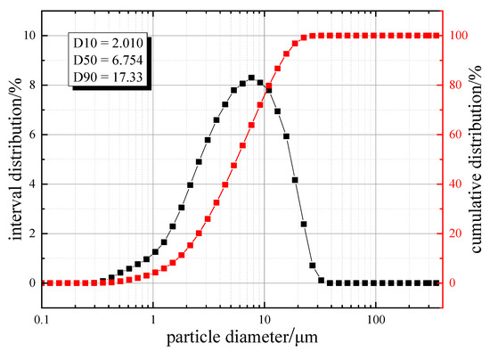 The particle size distribution of the blast furnace dust is shown in Figure 3. D10, D50, and D90 indicate the particle size when the cumulative particle size distribution number reached 10%, 50%, and 90%, respectively. D50 is also called xdmedian size or median particle size. It can be seen that the particle size of xdblast furnace dust is small, with a particle size distribution in the range of 0.2–40 μm, and D50 was 6.754 μm. We found that, 10% of the dust was less than 2.010 μm, 50% was less than 6.754 μm, and 90% was less than 17.33 μm. In addition, particles with a size below 2.5 μm accounted for about 20.14% of the total, and particles with a size below 10 μm accounted for about 79.77% of the total. These dust particles below the particle size can cause serious air pollution, which is why they are the key target of blast furnace dust capture.