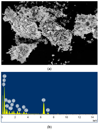 Figure 4a shows that the blast furnace dust particles are varied in size and showed an irregular shape and a porous structure. The particles were either connected or dispersed with each other, which may be due to the various chemical changes accompanying the combustion process, resulting in the particles bonding together to form larger particle clusters during cooling. Figure 4b shows that the metallic elements in the blast furnace dust were mainly Ca, Na, Fe, and Al, and the inorganic elements Si and C were the most abundant.
