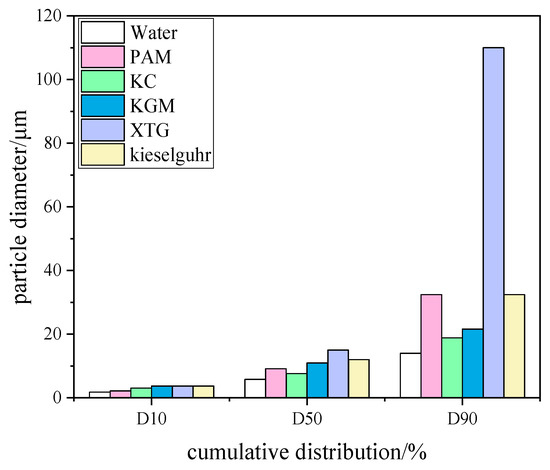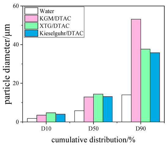 According to Nsengiyumva [36], when two different chemical coagulation solutions are mixed together, they may exhibit synergistic effects. DTAC at 9 mg/L was chosen as the surfactant to study the effect of synergistic interaction between surfactant and chemical coagulant on blast furnace dust capture. The chemical coagulants involved in the synergistic effect were changed to XTG, kieselguhr and KGM at 10 mg/L, and the effects of the synergistic effect of XTG/DTAC, kieselguhr/DTAC, and KGM/DTAC on the agglomeration effect of blast furnace dust were investigated. The results are shown in Figure 13. Compared with Figure 9 and Figure 13, it was found that the D10 particle size increased slightly under the synergistic effect compared with the addition of DTAC only, but the D50 and D90 particle sizes decreased. When comparing Figure 5 and Figure 13, it was found that the D10 particle size increased slightly under the synergistic effect of XTG/DTAC compared to the addition of XTG only, and the D10 particle size was 4.738 μm. However, the D50 and D90 particle sizes were smaller than that of XTG only. Similarly, the D10 particle size increased slightly with kieselguhr/DTAC synergy compared to that with kieselguhr only, and the D10 particle size was 4.031 μm. Unlike the XTG/DTAC synergy, the D50 and D90 particle sizes with kieselguhr/DTAC synergy were smaller than those with kieselguhr only. The particle size of D10 did not change under KGM/DTAC synergism compared with that of KGM only, but the particle sizes of D50 and D90 increased significantly, corresponding to 12.9 μm and 53.16 μm, respectively. At this time, the addition of polymeric chemical coagulants can make the small flocs become large flocs through adsorption and bridging effects. Therefore, the addition of a DTAC cationic surfactant increased the possibility of bridging with other polymeric chemical coagulants. In addition, polymer molecular chains tended to intertwine and form a mesh structure, thus increasing the possibility of particle capture and aggregation [37].