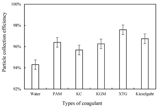 Different types of chemical coagulants have different effects on particle agglomeration. In this study, five coagulants, PAM, KGM, KC, XTG, and kieselguhr, were selected at a concentration of 15 mg/L, and the experimental results are shown in Figure 5. The D10 particle sizes of the five coagulants showed no significant differences, but the differences were more obvious for D50 and D90. The sequence of the corresponding particle sizes of D90 were XTG, kieselguhr, PAM, KGM, and KC in descending order. XTG is a polymeric compound with strong hydrophilic properties, which dissolves in water and can form a highly viscous solution. XTG was added to the recirculation basin and sprayed into the dust collector through the nozzle as droplets, which collided with fine particles and bound together in a “bridging” manner to form larger particle clusters. The addition of a chemical coagulant makes the fine particles grow, increasing the probability of particle capture and improving the dust removal efficiency. Regarding the consumption of reagents, a simple calculation showed that less than 1.5 kg of agent was required to treat 100,000 m3 of gas. Therefore, the cost of the reagents was low.