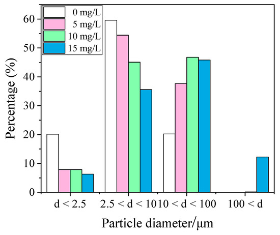 The agglomeration effect of adding different concentrations of chemical coagulants was different. XTG, which had a better agglomeration effect, was selected to investigate the effect of concentration. Four different concentrations of XTG, 0 mg/L, 5 mg/L, 10 mg/L, and 15 mg/L, were added to the circulating pool for the experiment. As can be seen in Figure 7, the content of large-size particles gradually increased with an increase in coagulant concentration. Without XTG, 20.14% of PM2.5, 79.77% of PM10, and 20.23% of particles within 10–100 μm were found. When XTG was added, the PM2.5 content was significantly reduced. A concentration of 5 mg/L of XTG can reduce the PM2.5 content to 7.9% and the PM10 content to 62.33%, and the particulate matter content within 10–100 μm increased significantly to 37.67%. When the XTG concentration was 10 mg/L, the PM2.5 content remained basically unchanged, the PM10 content continued to decrease, and the content of particulate matter within 10–100 μm was dominant. There was particulate matter with a particle size larger than 100 μm, and the content of particulate matter with a particle size larger than 100 μm was 0.2%. When the XTG concentration was 15 mg/L, the PM2.5 content was reduced to 6.32% and the PM10 content was reduced to 41.9%. The dust particle size was concentrated between 10 μm and 100 μm, and the dust content in this particle size range was 45.85%. The proportion of particles larger than 100 μm increased to 12.25%. In general, chemical coagulant molecules contain chemical groups that can interact with the particle surface. When a chemical coagulant molecule collides with a particle, some groups in the chemical coagulant molecule will be adsorbed on the surface of the particle, while the rest of the particle can be in contact with other collision particles, resulting in secondary adsorption. In this way, the particles formed aggregates with each other by the action of chemical coagulant molecules [18,34]. Therefore, the particle growth was better with an increased concentration of the coagulant.