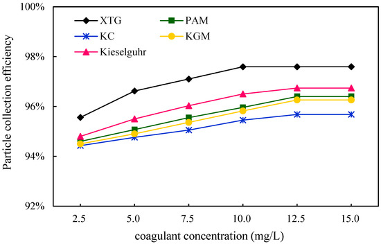 In order to investigate the effect of chemical coagulant concentration on the removal of blast furnace dust in WESPs, dust at the inlet and outlet of the dust collector was collected through the sampling tube, and the dust removal efficiency of the five coagulants at different concentrations was calculated. As can be seen in Figure 8, the dust removal efficiency of the five chemical coagulants at different concentrations were XTG, kieselguhr, PAM, KGM, and KC in descending order, and the dust removal efficiency increases gradually with the coagulant concentration. The maximum efficiency of XTG was achieved at a concentration of 10 mg/L, and the efficiency did not change significantly when the concentration of XTG was increased. XTG has excellent physical and chemical properties. Compared with the several other agglomerating agents used, it has good dust coagulation and dust removal effects. XTG helical molecules can agglomerate fine particles into larger particles under the action of van der Waals forces, hydrogen bonds, hydrophobic interactions, etc. However, it has the disadvantage of poor solubility, and it can easily form a non-conductive coating layer on the electrode surface. When the concentration is high, the electrostatic precipitator cannot work normally. When the chemical coagulant is added in excess, the particle surface is saturated by the chemical coagulant molecules and there are no adsorption vacancies on the particle surface, so the chemical coagulant loses its bridging effect. At the same time, due to the effect of polymer adsorption membrane vacancy resistance or mutual repulsion between the particles, the particles were again in a stable state of dispersion. In addition, continuing to increase the concentration of the coagulant leads to corona discharge performance degradation, resulting in a decrease in the capture efficiency of blast furnace dust. Therefore, the amount of chemical coagulant should be moderate, as more does not necessarily mean better.