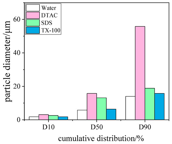 In order to investigate the effect of surfactants on the efficiency of WESPs at trapping blast furnace dust, three different surfactants, dodecyl trimethyl ammonium chloride (DTAC), sodium dodecyl sulfate (SDS), and octylphenyl polyoxyethylene ether (TX-100), were selected. The surfactants, in line with the experimental method of chemical coagulants, were injected into the recirculation basin and entered the dust collector through the nozzle. After the experiment, the particle size distribution was measured by collecting the particles in the recirculation basin. The results are shown in Figure 9. The more obvious agglomeration effect was shown by DTAC, followed by SDS, and TX-100 basically had no agglomeration effect. There was no significant change in D10 after the addition of a surfactant compared with no agent. When no agent was added, the particle D50 and D90 were 5.8 and 14 μm, respectively. When the surfactant TX-100 was added, the D50 and D90 increased to 6.382 and 15.75 μm, respectively. When SDS was added, the D50 and D90 increased to 13.14 and 18.87 μm, respectively. When DTAC was added, the D50 continued to increase. Therefore, among the three surfactants, the best effect on the agglomeration of blast furnace dust was exhibited by DTAC. The surfactant molecules completed the adsorption of fine dust and water molecules through hydrophobic bonding and electrostatic interactions, forming an adsorption configuration in which hydrophobic groups were adsorbed on the surface of fine particles and hydrophilic groups were extended to water; thus, the wetting of the dust was achieved. At the particle/water interface, the surfactant molecules were adsorbed on the particle surface due to the influence of van der Waals forces. However, when the surfactant molecules were adsorbed on the surface of the particles, their oxygen-containing groups tended to form hydrogen bonds with water molecules, and such hydrogen bonds had a lifting effect on the surfactant molecules, causing the surfactant molecules to aggregate at the interface. Multiple such particles wrapped by water film collide with each other to achieve particle aggregation [35].