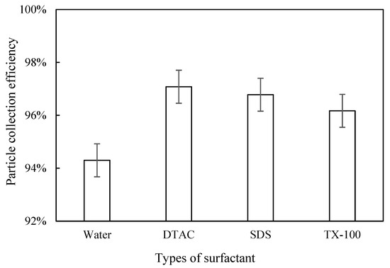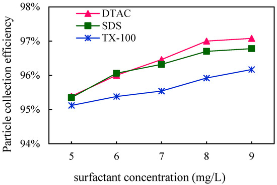 We measured the inlet and outlet dust concentration after adding DTAC, SDS, and TX-100 and calculated the dust removal efficiency. As can be seen in Figure 10, the dust removal efficiencies were all improved with the addition of surfactants. When DTAC was added, the highest dust removal efficiency of 97.08% was achieved. When the surfactant was TX-100, the dust removal efficiency was the lowest at 96.17%. The dust removal efficiency was between that of DTAC and TX-100 when SDS was added (96.78%). Among the three surfactants, the addition of DTAC resulted in the best particle growth, the best corona discharge performance, and the highest dust removal efficiency. We find that the effects of the three selected surfactants on dust growth and corona discharge performance remained consistent, which was different from the effect of chemical coagulants, and this phenomenon is likely related to their different solubilities in water.