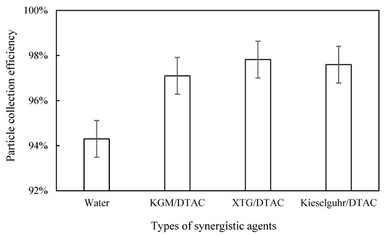 The inlet and outlet dust concentrations after adding KGM/DTAC, XTG/DTAC, and kieselguhr/DTAC were measured, and the dust removal efficiency was calculated separately. As can be seen in Figure 14, the highest dust removal efficiency of 97.82% was achieved with the synergistic effect of XTG/DTAC. Compared with the highest dust removal efficiency when only XTG or DTAC was added, both increased, but the increase was smaller. The dust removal efficiency reached 97.60% with the synergistic effect of kieselguhr/DTAC, which was a smaller increase than when only kieselguhr or DTAC was added. The dust removal efficiency with KGM/DTAC synergy was the lowest among the three, at 97.10%. The efficiency was significantly higher compared to when only KGM was added, but the dust removal efficiency was almost unchanged compared to when only DTAC was added. KGM is a gel with a stable cross-linking structure, which has hydrophobic and strong hydrogen bonding effects, and DTAC also has hydrophobic association effects. Under the synergistic effect of two chemical coagulants, the surface of blast furnace dust will generate a hydrophobic effect, and it will agglomerate into larger particles via the bridging effect of the chemical coagulant, thus improving the dust collection efficiency. Therefore, the addition of a surfactant to the chemical coagulant would improve the dust removal efficiency. The improvement of dust removal efficiency was not obvious, but this increases the economic cost. For a coagulant with a low dust removal efficiency, the addition of a surfactant can significantly improve the dust removal efficiency.