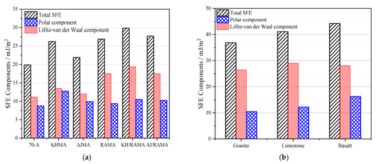 To ensure the accuracy of the test, the contact angle data were re-measured if the coefficient of variation CV of the test results exceeded 5% in the tests measuring the contact angle θ. The test data are shown in Table 9 and Table 10. The contact angle data were substituted into Equation (6) and the matrix equation was solved to obtain the ΓA of the asphalt and aggregate, the dispersion component , and the polarity component , as shown in Figure 3.