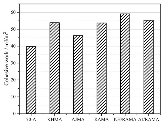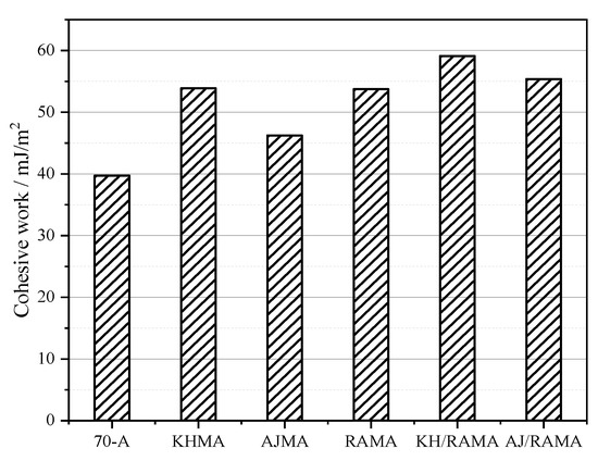 Cohesion work is an important parameter in fracture mechanics and is used to account for the energy required for microcrack growth in asphalt binders. The cohesive work characterizes the adhesion properties of the asphalt itself; the larger the value, the better the crack resistance, and the more difficult it is for moisture to penetrate the asphalt film into the asphalt-aggregate interface. The cohesive work is the energy required to fracture a homogeneous substance at a constant vacuum temperature and produce two identical interfaces, so the cohesive energy of an asphalt material can be considered as twice the surface energy of asphalt [32,33], which can be expressed in Equation (7) as: