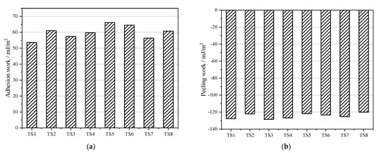 The adhesion work under anhydrous conditions characterizes the amount of the energy released to the outside world when the asphalt and aggregate are combined into an asphalt-aggregate system; the greater the adhesion work, the more stable the asphalt-aggregate system, the better the adhesion. The adhesion work under water conditions can also be referred to as the stripping work, which characterizes the internal structure of the asphalt mixture, and the dynamic water pressure formed inside the mixture under the action of external load will flush the asphalt mixture, and the moisture will gradually replace the asphalt film wrapped around the aggregate surface; therefore, the asphalt-aggregate system inside the mixture is dispersed into two systems of asphalt-water and water-aggregate. In this process, the energy released from the system to the outside world is the spalling work, and the greater its value, that is, the more energy released from the system to the outside, the easier it is to replace the asphalt paste film that wraps the surface of the aggregate, and the greater the likelihood of water damage disease in the asphalt mixture [34].