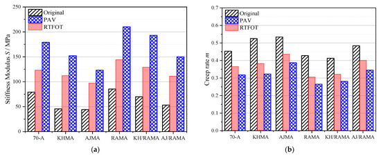 In order to study the effect of six groups of asphalt in thermal oxygen aging on the low temperature creep performance of asphalt, this paper conducted bending beam rheological tests on the original sample asphalt, short-term aging (RTFOT) after asphalt, long-term aging (PAV) after asphalt in the low-temperature environment at −12 ℃, and the test results are shown in Figure 9.