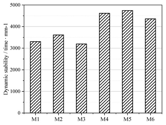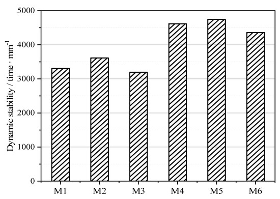 From Figure 10, the dynamic stability of granite asphalt mixes in all six groups is greater than 2800 times/mm, which meets the requirements of highway asphalt pavement construction specifications for the high-temperature performance of asphalt mixes. When compared to M1, M3’s dynamic stability declined, showing that the amine anti-stripping agent AJ-1 had a negative impact on the granite asphalt mixture’s high-temperature stability. This is mainly because the amine anti-stripping agent contains more light components such as oil, which reduces the elastic component ratio of the asphalt mixture. The irreversible deformation rises when the combination is exposed to external stress, which reduces the granite asphalt mixture’s high-temperature stability. The dynamic stability of both M2 and M4 was improved compared with M1, indicating that the silane coupling agent and glauconite asphalt enhanced the deformation resistance of the granite asphalt mixture under a high-temperature environment. This is mainly because the silane coupling agent can establish a “molecular bridge” with special functions between inorganic stone and organic polymer asphalt, forming an interface layer between stone and asphalt, and the interface layer can transmit stress, thereby enhancing the deformation resistance of the asphalt mixture. The chemical formula of Qingchuan rock asphalt is similar to that of matrix asphalt, and there is good compatibility between them. Therefore, when Qingchuan rock asphalt is added to the matrix asphalt, the asphaltene in Qingchuan rock asphalt is cross-linked with the macromolecular group of the matrix asphalt, which increases the strength of the asphalt molecular network structure and reduces the intermolecular voids, thereby significantly increasing the high-temperature stability of the granite asphalt mixture. M5 has the highest dynamic stability, indicating that the composite superposition of rock asphalt and silane coupling agent has a positive effect. The dynamic stability of M6 is slightly lower than that of M4. The oil molecules in AJ-1 reduce the high-temperature stability of RAMA.