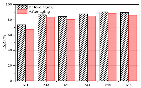 The TSR of the six groups of granite asphalt mixes had different degrees of reduction after long-term aging, and there were some differences in the changes of residual stability after long-term thermal-oxidative aging. The greatest reduction was observed for the matrix asphalt. It can be seen that the adhesion of the matrix asphalt without an anti-stripping agent to granite aggregate decreased significantly after aging, and the asphalt was more easily replaced by water molecules under pressure. It can be seen that the residual stability of Qingchuan rock asphalt added is significantly greater than the residual stability of other anti-stripping agents, indicating that the aging resistance of Qingchuan rock asphalt is strong and is primarily due to the presence of nitrogen. After long-term aging, the residual stability of M2 and M3 does not meet the requirements of the specification greater than 85%, and the residual stability of M4, M5, and M6 is greater than 85%. Moreover, rock asphalt has undergone long-term oxidation and condensation in the natural environment, its oxidation resistance is enhanced, and its properties are very stable, thereby greatly improving the durability of modified asphalt. The residual stability of M5 and M6 is the highest after aging, and the residual stability of composite modifiers is significantly higher than that of a single anti-stripping agent.