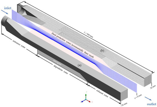 Scheme of (a) the horizontal MOCVD reactor geometry and (b) the structured hexahedral mesh of reactor (half view is shown for better clarity).