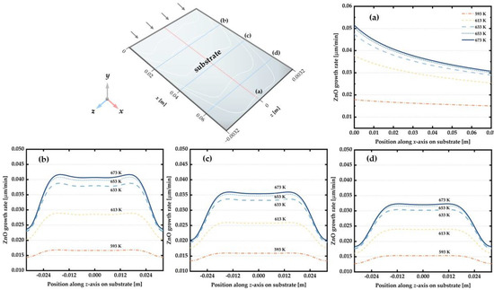 The lateral variation of ZnO growth rates was further examined for three different positions of the substrate: x = 0.02 m, x = 0.04 m and x = 0.06 m. For mass-transfer controlled depositions at temperatures ranging from 613 to 673 K, the ZnO growth rate distributions initially presented a lower growth rate in the center and higher growth rate on both sides along the z-axis of the substrate (see Figure 4b). This was probably caused by a lateral inward (positive) vortex motion, driving the gas flow to move upward near reactor walls and downward in the center, which provided a more effective supply of reactants on the sides. However, as the temperature and flow profiles gradually developed, this phenomenon was less pronounced at the edge of the substrate as shown in Figure 4c,d. However, at the transition temperature of 613 K, the lateral distribution was slightly affected by the vortex motion, revealing that the mass transport and chemical kinetics both contributed to the distribution behavior of ZnO growth rate. Additionally, contrary to mid-temperature range, ZnO films exhibited a more uniform distribution at 593 K due to the predominant chemical kinetics.