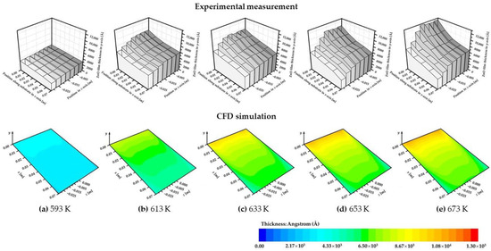 A comparison between the numerical results and experimental data for ZnO deposition rates are plotted as a function of temperature (593 to 713 K) in Figure 3. A good agreement was achieved; the 3D modelling predictions agreed well with the experimental deposition rates at low- and mid-temperature ranges, but not as well at the high-temperature range. The discrepancies between the experimental and CFD results at 613, 633 and 713 K were possibly due to experimental errors, within the averaged relative experimental error less than 2%.
