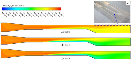 Due to the excess of t-BuOH, DEZn became the limiting species that dominated the ZnO deposition process. The concentration distribution of DEZn on the susceptor was directly impacted by the thermal fields, and it was closely related to the growth rate and uniformity of the deposition in the reactor. Figure 9 shows the concentration distribution of DEZn at different temperatures. Affected by the “cold-finger” effect, the concentration of DEZn was depleted along the susceptor length, which led to the decay of ZnO growth rates downstream, consistent with the previous observations. The concentration profiles remained almost unaffected at varied temperatures. As was shown in the previous discussion, the ZnO deposition was kinetically controlled at 593 K. Figure 9a shows a thin concentration boundary layer, revealing that most of DEZn species were taken away by the bulk gas flow before the surface reaction took place. In the diffusion-dominated regime, the reaction rate of surface reaction was assumed to be very quick and a similar concentration profile was found above the substrate. The diffusion rates increased with increasing temperature, so that the consumption of DEZn species at 673 K was slightly greater than that at 633 K above substrate (see Figure 9b,c). Moreover, it was discovered that the upstream recirculation rolls tended to concentrate the heavier species, i.e., DEZn, in the colder regions, which improved the precursor supply for a more uniform deposition, and effectively prevented gas phase pre-reactions in the entrance zone. However, the downstream rolls drove unreacted species to the top surface of the reactor, which resulted in the unwanted postgrowth of an extra amount of film on the top wall, as shown in Figure 9d.