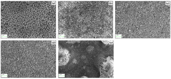 SEM image of the ZnO thin film at temperatures of (a) 593 K; (b) 613 K; (c) 633 K; (d) 673 K; and (e) 713 K.