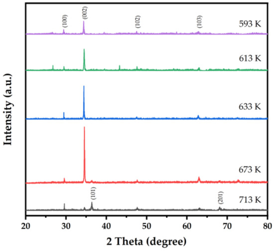 The XRD patterns of ZnO films with the 2θ angle ranging from 20° to 80°are shown in Figure 11 to demonstrate the temperature effects of deposited thin films. All the diffraction peaks were indexed as a high purity hexagonal ZnO wurtzite structure (JCPDS Card No. 36-1451). At the low- and mid-temperature region (593 K to 673 K), the dominated (002) peak was observed at 2θ value of 34.5°, indicating that ZnO thin films had a highly preferred c-axis orientation along the (002) plane. The XRD patterns also show the slight peak at 2θ of 29.6° and 63.0°corresponding to the lattice planes (100) and (102), as well as a very weak peak corresponding to the (103) plane at 47.6°. The detected peaks were almost unchanged with the increase in deposition temperature and a small difference in peak intensities of (100) and (103) plane was observed. When the temperature reached 673 K, the (002) peak intensity of ZnO thin film became significantly stronger, which indicates that the vertical alignment of ZnO film on the substrate was enhanced. It could be indexed to the excellent hexagonal structure and high degree of crystalline orientation. However, as the temperature further rose to 713 K, the pronounced diffraction peak changed into a 2θ value of 36.4° that corresponded to the lattice plane (101) and a minor contribution of (201) plane at 68.2°. This shows that the (101) plane of the ZnO film had a higher intensity than the (002) plane, and that the preferred orientation of the ZnO changed to a wurtzite structure. The possible reason for such change is the high temperature caused thermal desorption, the O species were removed from the crystal structure of ZnO and a number of Zn atoms became dominant, leading to the Zn-enriched (101) plane, and hence the hexagonal (002) plane was suppressed relative to wurtzite (101) [34].