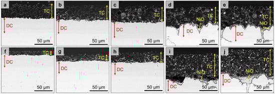 SEM cross-sections of the coatings issued from (a) HS-Ar, (b) HS-700, (c) HS-650, (d) HS-600, (e) HS-air, (f) DS-Ar, (g) DS-700, (h) DS-650, (i) DS-600 and (j) DS-air.