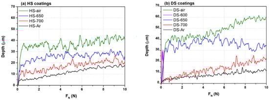 Penetration depth in the coatings as a function of the applied load FN during scratch tests. (a) HS coatings, (b) DS coatings.