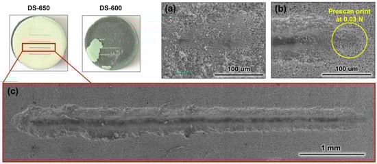 Macrographs of DS-650 and DS-600 after the scratch tests and corresponding SEM micrographs in SE mode of (a) the bottom of the scratch, (b) the beginning of the scratch and (c) the scratch in full length.