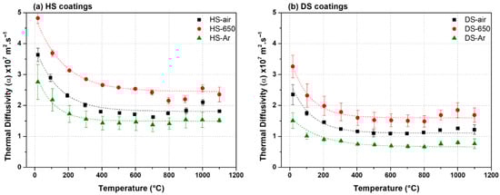 The thermal diffusivity of the top coatings calculated via laser-flash measurements of the complete system (substrate + aluminide + top coating) is presented in Figure 7. All the coatings display thermal diffusivity values ranging between 0.8 × 10−7 and 5.0 × 10−7 m2·s−1 and a decreasing trend with increasing temperature. When comparing the two different types of microparticles, the HS microparticle-based coatings display higher thermal diffusivity than the DS ones, with ranges from 1.4 × 10−7 to 5.0 × 10−7 m2·s−1 and 0.8 × 10−7 to 3.3 × 10−7 m2·s−1, respectively. Irrespective of the type of microparticles (DS or HS), the lowest thermal diffusivity is found for the least oxidised coatings (Ar) and the highest for those sintered in Ar + air at 650 °C.