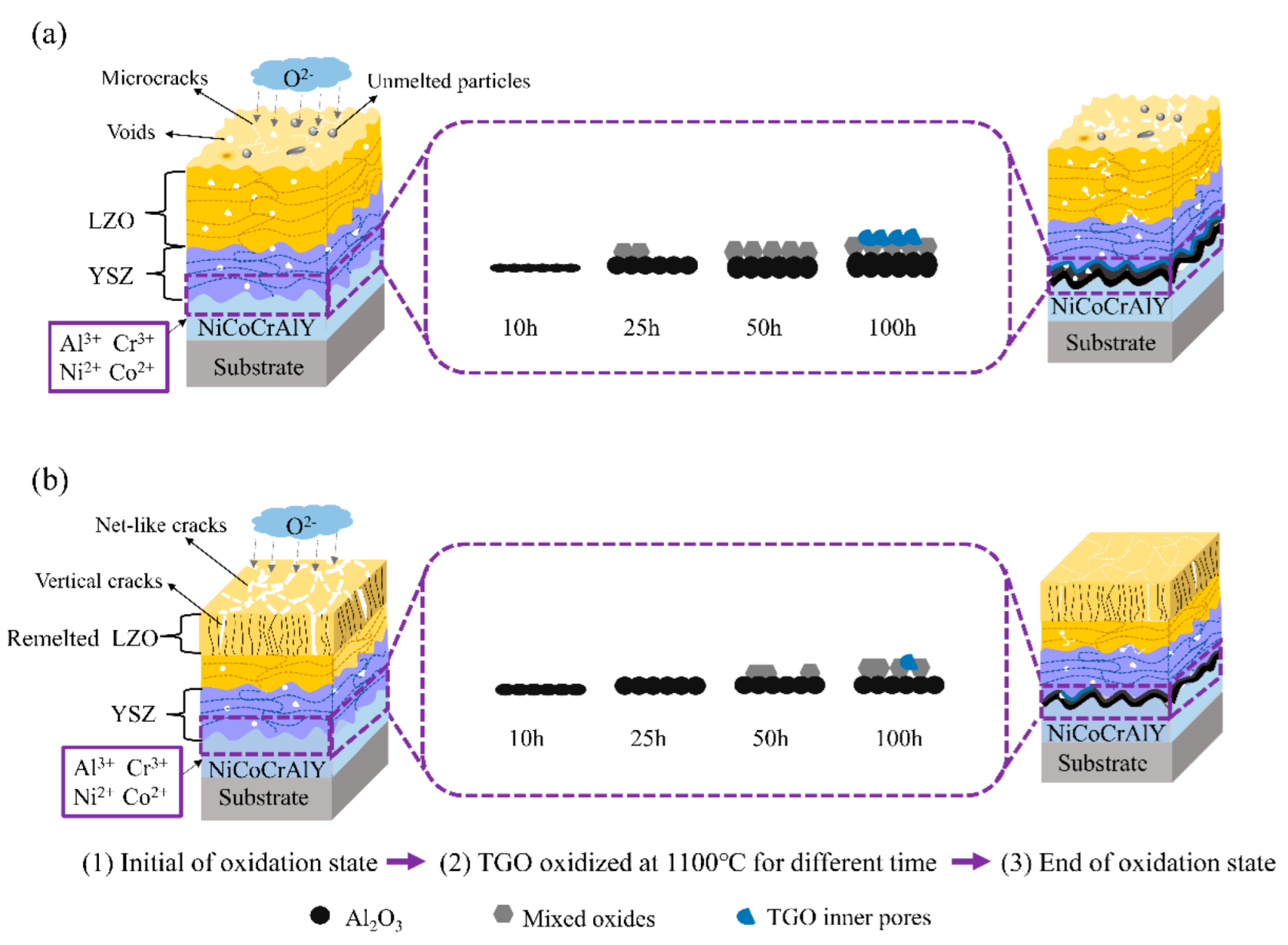 - The Al2O3 thickness proportion of the total TGO layer in LR TBCs always remained greater than that in the AS TBCs upon the 10 h isothermal oxidization, and laser scanning remelting was effective at inhibiting TGO growth and increasing the high-temperature isothermal oxidation resistance of LZO/YSZ TBCs.