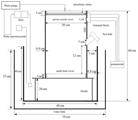 With a Q235 carbon steel sheet as the base material, galvanized steel and zinc–aluminum alloy coated steel were prepared. Copper was also selected as the grounding material. The thickness of the zinc layer of galvanized steel is about 30 μm, and the thickness of the zinc–aluminum alloy coating is about 100 μm. A total of 110 samples of each grounding material were selected for experiment and field research. In order to better realize the accelerated corrosion research, the experimental temperature of the accelerated corrosion research in the laboratory was set to 60°, and corrosion medium was 20% moisture content red soil of the Qili substation (Ganzhou, China). The purpose of this accelerated experiment was to simulate the corrosion of grounding materials under the acid red soil on the ground. The schematic diagram of the device is shown in Figure 1.