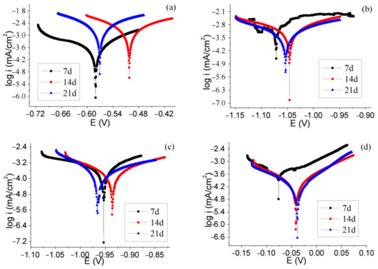 The polarization curve corrosion test of four grounding materials was carried out in the laboratory for 7 days (d), 14 days, and 21 days as shown in Figure 2.