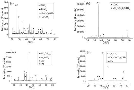 XRD patterns of corrosion products of four grounding materials, (a) carbon steel, (b) galvanized steel, (c) Zn–Al-coated steel, (d) copper.