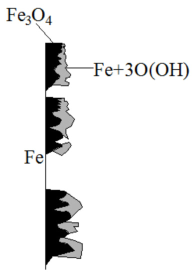 The corrosion mechanism of grounding materials in red soil was also studied. The corrosion diagram of carbon steel in red soil is shown in Figure 7. The corrosion products of carbon steel in red soil present a layered distribution. The bottom layer corrosion products are uniform and dense, which can hinder the penetration of corrosive media. The surface corrosion products are loose and porous, and symbiotic with the soil, where they often appear pitting pits [14]. Gerwin, W. and Baumhauer, R. et al. [21] also found delamination in the study. Due to the influence of corrosion product diffusion, the composition and concentration of corrosion products of metal surface are also different. The metal bottom layer is covered by the dense corrosion product layer (DCPL), which is composed of iron oxide and oxyhydroxide. Outside the DCPL layer is the transmission medium layer (TML), which mainly includes a mixture of corrosion products and quartz from the surrounding environment.