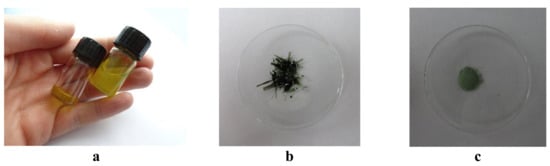Step one involved the synthesis of a WO3 sol. First, peroxo-tungstic acid (PTA) was synthesized by reacting 5 g of tungsten monocrystalline powder (mean particle size < 1 micron, purity 99.95%, Sigma-Aldrich GmbH, Schneldorf, Germany) with 20 mL of hydrogen peroxide (30%, Belinka). This reaction is strongly exothermic. Sols where then prepared by adding solvent to the PTA solution at 120 °C. The addition of alcohol resulted in the formation of the W-ether that polymerizes to peroxopolytungstic acid (P-PTA) []. Solvent for inkjet printing ink should have boiling point higher than 100 °C, therefore WO3 sol used in this study as ink was prepared with a mixture of two solvents with different boiling points, i.e., 2-propanol (ACS reagent, Sigma-Aldrich GmbH, Schneldorf, Germany) and 2-propoxy ethanol (Puriss, Sigma-Aldrich, Schneldorf, Germany). The ink appeared slightly orange and contained 27.7 mmol of tungsten per 30 mL of sol. Figure 1 presents the WO3 sol and gel state—Figure 1a, the WO3 xerogel dried at RT—Figure 1b and the WO3 powder annealed for 1 h at 450 °C—Figure 1c. More details on the preparation of the sols could, also the ones based solely on ethanol and 2-propanol could be found in Ref [].